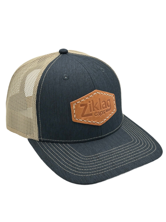 Heathered Navy/Khaki Adjustable Trucker Cap with Genuine Leather Patch