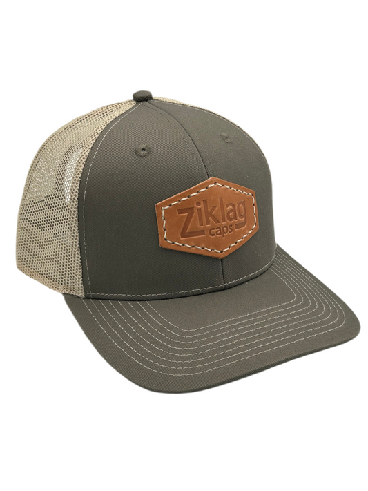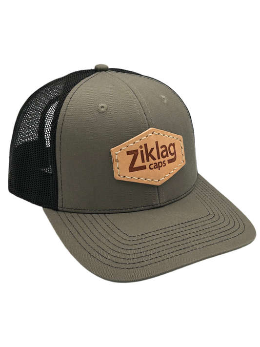 Olive/Black Adjustable Trucker Cap with Genuine Leather Patch